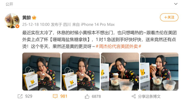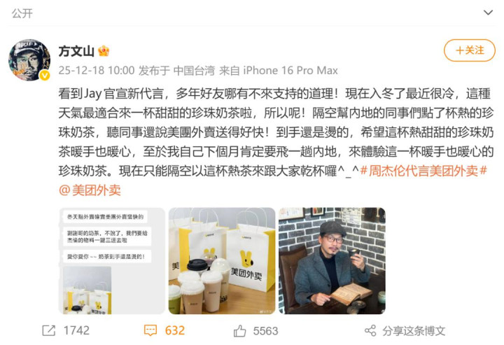 此外,记者还注意到,美团外卖官宣周杰伦成代言人后,吴尊、黄龄和方文山等明星也纷纷联动发声支持打call。