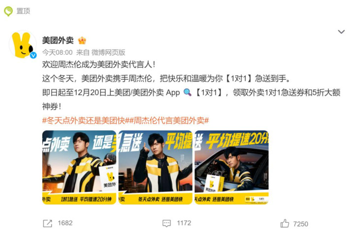 12月18日,美团外卖官宣周杰伦出任其品牌代言人,并先后推出主题为“冬天点外卖,还是美团快”的两支广告宣传片。